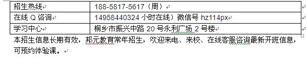 招生热线: 188-5817-5617(周);在线Q咨询: 149584403 微信号hz114px学习中心: 桐乡市振兴中路20号永利广场2号楼本招生信息长期有效,邦元教育常年招生,欢迎来电、来校、在线客服咨询最新开班信息,可预约体验课。...